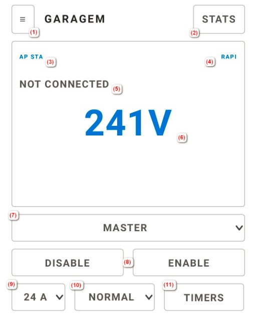 AP - Modo WiFi Access PointSTA - Ligado a um Access PointDEL - Temporização de delay tocar para desativarDUR - Temporização de duração tocar para desativarCH - Temporização de constrangimento de carga tocar para desativarMASTER - Cenário manual (função OFF)Auto Bi-Horário - Liga o EVSE apenas em período VAZIOAuto Scene - Liga o EVSE apenas durante os períodos definidos pelo utilizadorMANUAL - Não altera amperes automaticamenteNORMAL - Carrega dinamicamente até ao valor máximo definido em (9)POWER - Carrega o máximo que o consumo global da casa permiteSOLAR - Carrega energia solar, mantendo um mínimo de 6A