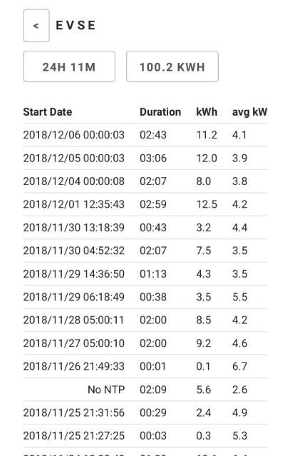 Data de inicio da carga. no caso de o EVSE não estar ligado à Internet aparece “No NTP”Duração da sessão de cargakWh consumidos da tomadaPotencia média de cargaNo topo da página aparecem contadores acumulados de tempo e energia consumida.