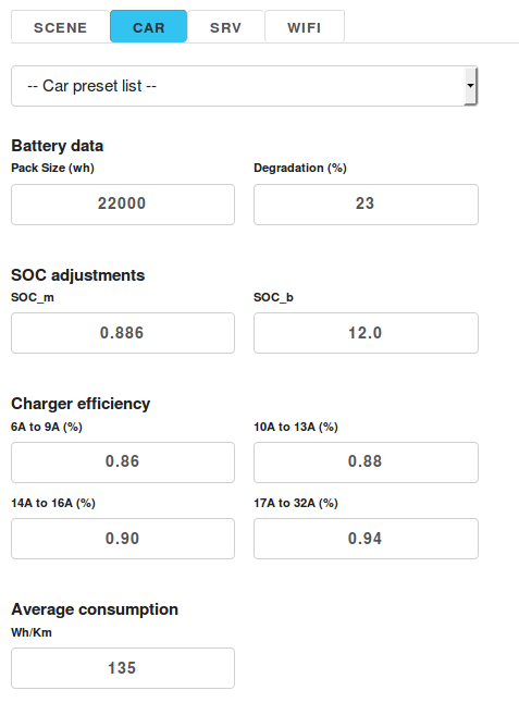 Pack size - Capacidade útil do pack de bateriasDegradation - Degradação estimada da bateriaSOC adjustments - Ajuste entre o SOC apresentado no quadrante do carro e o SOC real. SOC_m e SOC_b são os parâmetros da equação da reta que os relacionam e são obtidas por método empírico. No caso de não haver relação, SOC_m = 1 e SOC_b = 0Charger efficiency - eficiência de carga do carregador interno do veiculo nos intervalos indicados.Average Consumption - Consumo médio do carro, usado para poder programar cargas com base em Km.Quanto mais reais forem estes valores, mais aproximado é o resultado dos temporizadores avançados