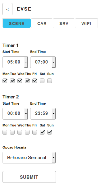 Esta página permite configurar até 2 temporizadores independentes dentro dos quais o EVSE fica habilitado a carregar. Fora destes horários o EVSE permanece desabilitado. A ativação desta funcionalidade é feita na pagina principal selecionando a cena Auto Scene.