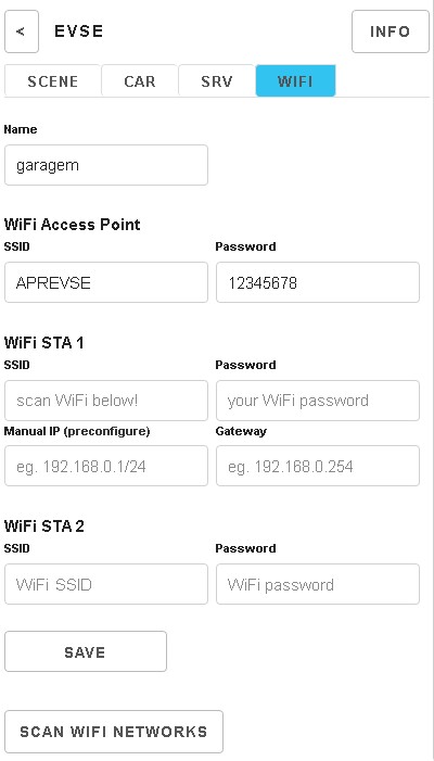 Name - Nome do EVSE, é usado na pagina principal do EVSE, no Emoncms e no MQTTWiFi Access Point - Credenciais de acesso em modo Access Point.WiFi STA1 - Credenciais de acesso a um Access Point existente. E possível definir um IP fixo. o link (preconfigure) preenche automaticamente os valores atuais.WiFi STA2 - Credenciais de acesso a um segundo Access Point existente. O EVSE apenas se liga a este SSID se não estiver presente a primeira rede.SAVE - guarda as configuraçõesSCAN WIFI NETWORKS - procura redes WiFi. ao clicar na rede WiFi é preenchido automaticamente o SSID do WiFi STA1.