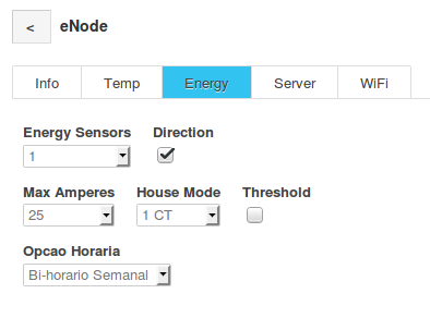 Energy Sensors - Numero de PZEMs presente no eNode. Default:1Direction - Deteção de sentido de corrente. Default:simMax Amperes - Amperes contratados ao fornecedor de energiaHouse Mode - Modo 1CT assume 1 sensor de corrente no fornecimento geral da instalação. O modo 2CT assum um eNode com 2 PZEMs onde o primeiro está ligado ao consumo e o segundo está ligado à produção solar. Default:1CTthreshold - envia alertas por MQTT se detetado consumo excessivo