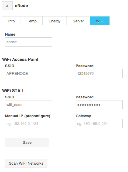 Name - Nome do eNode, é usado na pagina principal do EVSE, no Emoncms e no MQTTWiFi Access Point - Credenciais de acesso em modo Access Point.WiFi STA1 - Credenciais de acesso a um Access Point existente. E possível definir um IP fixo. o link (preconfigure) preenche automaticamente os valores atuais.SCAN WIFI NETWORKS - procura redes WiFi. ao clicar na rede WiFi é preenchido automaticamente o SSID do WiFi STA1.Após efetuar a configuração reiniciar o eNode, INFO -> REBOOT. Esperar um pouco e aceder ao eNode da mesma forma, navegar até à página ≡ -> INFO. Se o eNode conseguir ligar à rede WiFi anotar o endereço IP que aparece na secção NETWORK. Caso o eNode esteja ligado a uma rede WiFi externa, apenas radia o seu SSID interno durante os primeiros 5 minutos.